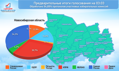 Благодаря нашему предыдущему опыту освещения хода выборов мэра и депутатов Совета депутатов города Новосибирска мы сумели организовать оперативную обработку информации, поступающую из всех 44 территориальных избирательных комиссий Новосибирской области. Разработанное нами программное обеспечение позволило в кратчайшие сроки генерировать слайды с графиками и диаграммами, наглядно отображающие ситуацию в районах и по области в целом.