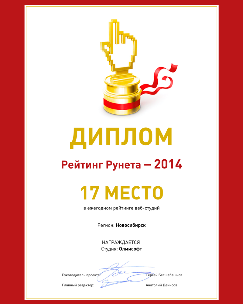 В рейтинге Рунета за 2014 год компания «Олмисофт» заняла 17 место. В рейтинге этого года от Новосибирска представлено 65 участников. Среди 165 компаний-участников рейтинга, представляющих Сибирский Федеральный округ, мы заняли 37 место. В рейтинге разработчиков мобильных приложений (сформирован на основе данных с начала 2013 года) «Олмисофт» занимает 3 место среди компаний города Новосибирска и входит в сотню лучших компаний России.